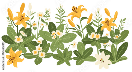 flower, lily, yellow flower, blooming, nature, garden, spring, summer, botanical, flora, floral arrangement, floral pattern, wildflower, meadow, field, botany, natural beauty, seasonal, organic, lush, greenery, foliage, leaf, plant, horticulture, flowering plant, ornamental, decoration, illustration, art, design, creative, vibrant, colourful, bright, cheerful, fresh, delicate, fragrant, flower petals, stem, bud, herb, shrub, vegetation, ecosystem, biodiversity