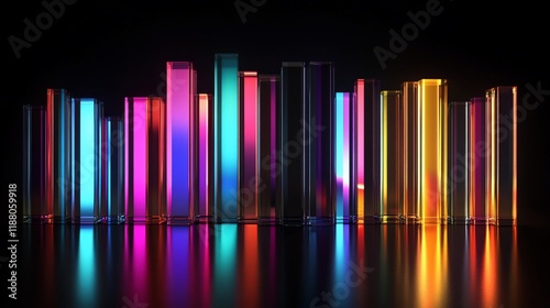 A vibrant display of colorful glass structures reflecting light in a dark setting.