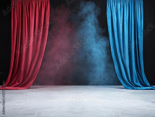 A vibrant display of red and blue curtains with smoke on a dramatic background.