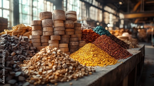 spice, herb, market, colourful, aroma, ingredient, culinary, favor, natural, organic, dried, texture, vibrant, food, cooking, trade, diversity, culture, health, nourishment, tradition, local, exotic, wooden, display, arrangement, variety, grain, seed, powder, yellow, red, brown, green, orange, rustic, warehouse, artisanal, craftsmanship, selection, harvest, freshness, quality, essential, earthy, aromatic, blending, seasoning, preservation