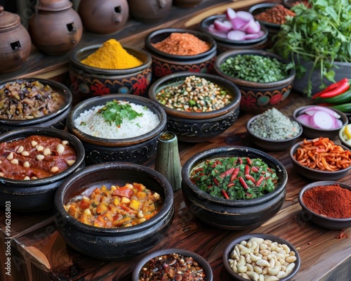 A vibrant display of various spices, herbs, and dishes arranged in bowls, showcasing colorful ingredients typical of a rich culinary culture.