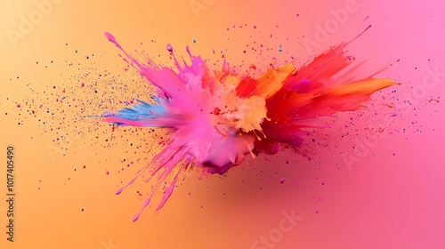 A vibrant explosion of pink, orange, and blue paint splatters across a warm, orange and pink background with small droplets of color scattered around.