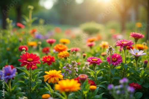 A vibrant field of colorful wildflowers bathed in warm sunlight, symbolizing the beauty and renewal of spring.