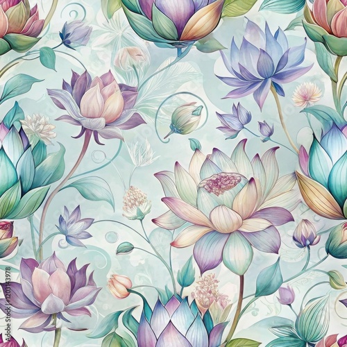A vibrant floral pattern featuring various lotus flowers and leaves in soft pastel colors on a light background.