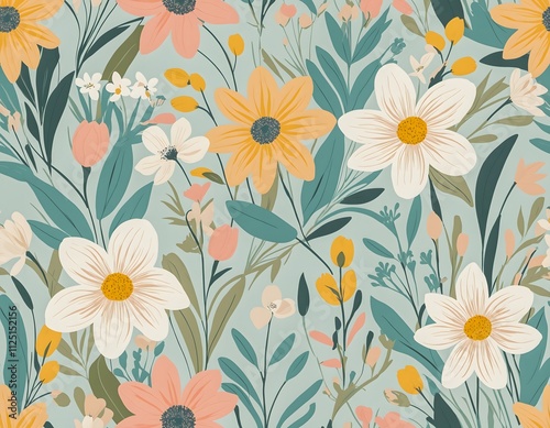 A vibrant floral pattern with yellow, peach, and white flowers and green leaves on a soft teal background, creating a lively, cheerful, and decorative design.