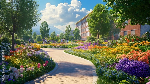 garden, flower, pathway, nature, tree, landscape, colours, beauty, sunlight, calmness, park, scenery, bloom, vegetation, outdoors, serenity, spring, summer, flora, horticulture, environment, relaxation, vibrant, scenic, colourful, peaceful, lush, greenery, sky, architecture, residential, community, wellness, biodiversity, wildlife, growth, design, aesthetic, harmony, gardening, planting, ecology, blossom, pathway, landscaping, natural, fresh, atmosphere