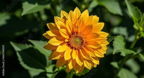 A vibrant, golden flower blooms brightly against a backdrop of lush greenery, showcasing detailed petal structure and a rich center.