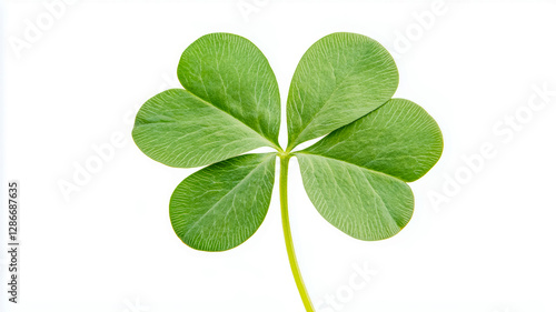 A vibrant green four-leaf clover on a white background, symbolizing luck and good fortune, on white background, Saint Patrick's Day