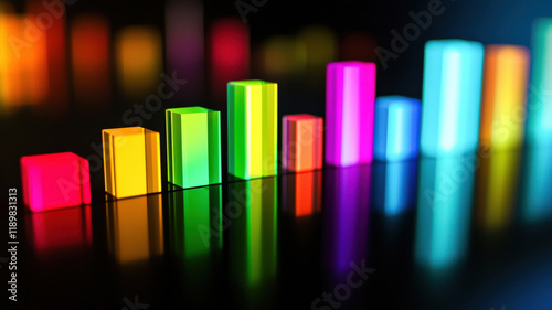 A vibrant histogram with glowing gradient-colored bars, aligned on a reflective black surface with subtle light effects, ideal for data visualization, tech marketing, or digital design