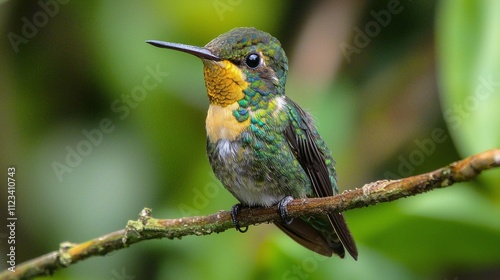 A vibrant hummingbird rests on a slender branch, its iridescent feathers glinting in the soft sunlight while nature's greenery envelops it