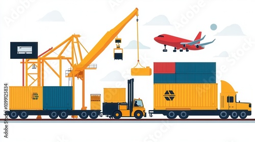 A vibrant illustration of a cargo transport scene featuring a crane, truck, containers, and an airplane, symbolizing logistics and shipping operations.