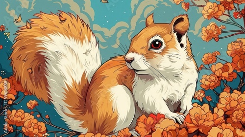 squirrel, flower, nature, illustration, art, wildlife, animal, orange, blue, colourful, cute, fur, tail, leaf, sky, vibrant, design, flora, fauna, portrait, cartoon, whimsical, detail, scenery, landscape, cheerful, playful, bright, aesthetic, creativity, fantasy, charme, environment, habitat, seasonal, outdoors, character, beauty, artistic, visual, composition, texture, imagery, botanical, small, critter, furry, adorable, dynamic