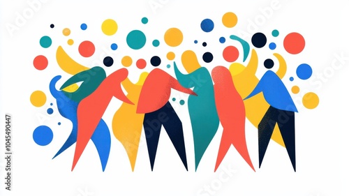 A vibrant illustration of abstract figures celebrating together amidst colorful circles, symbolizing joy and community.