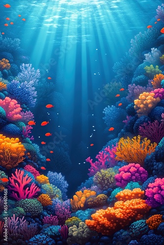 A vibrant illustration of an underwater coral reef teeming with marine life, but with no animals present.