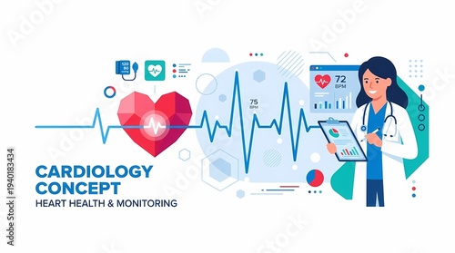 A vibrant illustration of cardiology concept, heart health monitoring, featuring a doctor, ECG waveform, and medical icons.