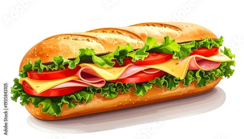 A vibrant illustration showcasing a long sandwich filled with deli meat, cheese, tomatoes, and crisp lettuce on a soft roll