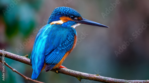 A vibrant kingfisher perched gracefully on a slender branch amidst a soft blurred backdrop outdoors