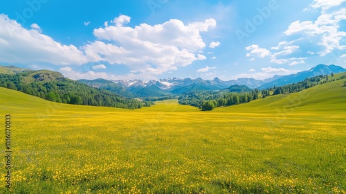 A vibrant landscape featuring a meadow of yellow flowers, rolling hills, and majestic mountains under a bright blue sky with fluffy clouds.