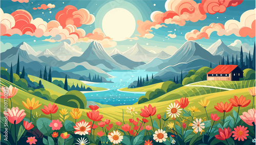 A vibrant landscape with rolling hills, mountains, and a bright sun in the sky