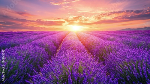 A vibrant lavender field at sunrise.