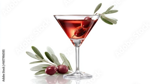 A vibrant martini cocktail garnished with olives and fresh olive leaves, perfect for any elegant occasion.