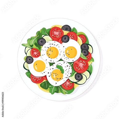 A vibrant, minimalist flat illustration of a Niçoise salad, featuring fresh ingredients like tomatoes, olives, and green beans on a clean white background, perfect for food-related designs.