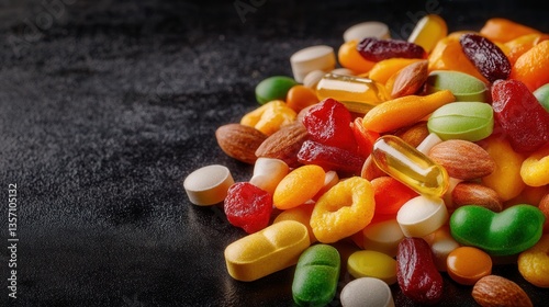 A vibrant mix of assorted vitamins pills capsules dried fruits and nuts on a dark background offe a healthy lifestyle concept.