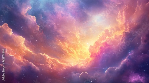 A vibrant nebula with clouds of pink, yellow, and orange with a starry background.
