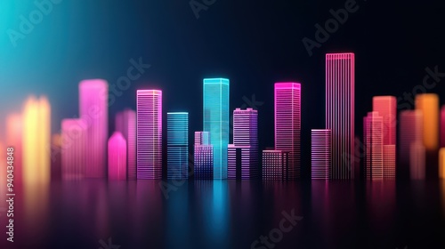 A vibrant neon city skyline with glowing buildings, reflecting colorful lights against a dark background, creating a modern urban atmosphere.