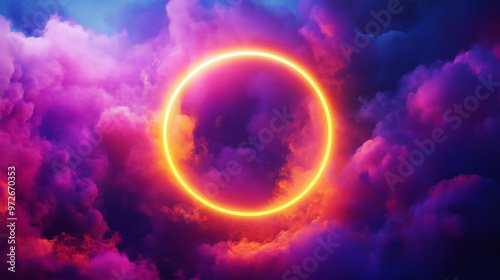 A vibrant neon glowing circle floating in the middle of a cloud of colorful mist.