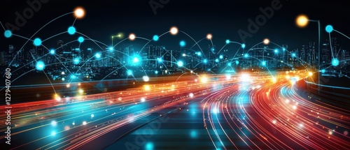 A vibrant nighttime cityscape with colorful light trails and glowing nodes, depicting the flow of traffic and connectivity.