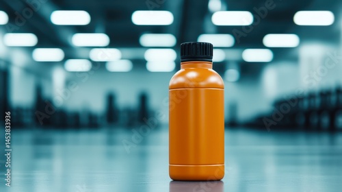 A vibrant orange water bottle stands out in a sleek, blurred gym background, ideal for promoting fitness, hydration, or health-related products, Perfect for marketing campaigns or wellness articles,