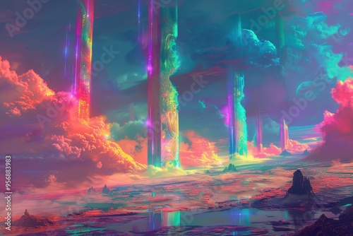 A Vibrant, Otherworldly Landscape with Glowing Towers and Clouds