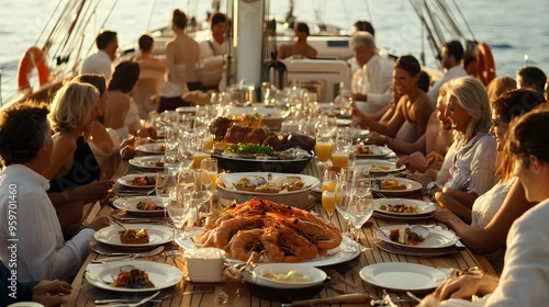 A vibrant outdoor dinner party on a sailing yacht features a beautifully arranged table filled with gourmet seafood and cocktails, surrounded by elegantly dressed guests enjoying the sunset ambiance.