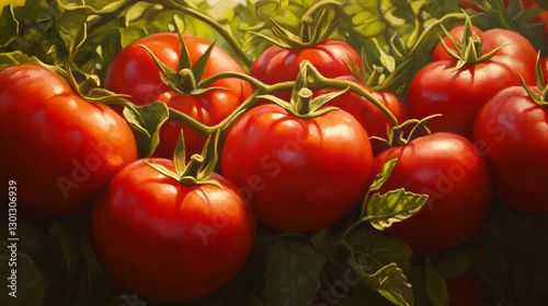 tomatoes, painting, vibrant, sun, vine, realistic, oil, artwork, nature, ripe, garden, fresh, harvest, summer, red, green, leaf, sunlight, warm, detailed, texture, food, organic, farm, countryside, composition, shadow, glow, realism, botanical, juicy, still, traditional, landscape