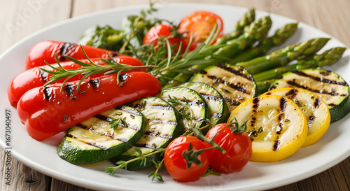 A vibrant platter showcasing grilled vegetables arranged artfully including zucchini, bell peppers, asparagus, and cherry tomatoes, adorned with fresh rosemary sprigs on a wooden surface