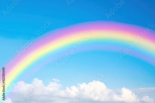 A vibrant rainbow arches gracefully across a clear blue sky with fluffy clouds below