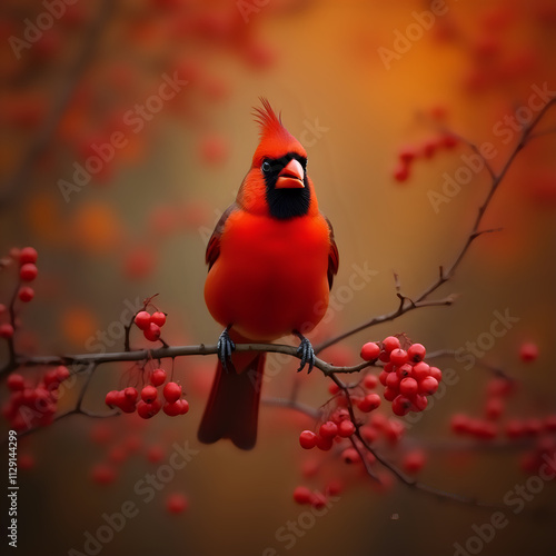 A vibrant red cardinal bird with a distinctive crest perches on a branch laden with red berries, set against a backdrop of blurred autumn foliage.