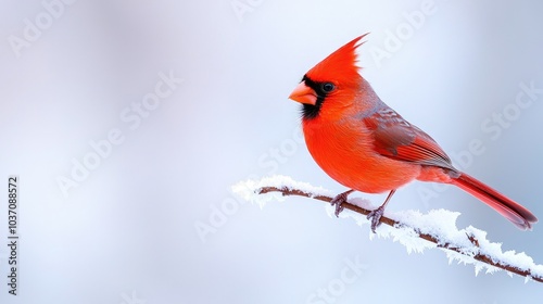 A vibrant red cardinal perched on a snow-covered branch, showcasing nature's beauty in a serene winter landscape.