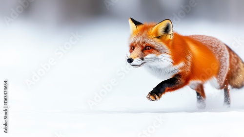 A vibrant red fox gracefully running through a snowy landscape, showcasing its striking orange fur and playful demeanor in a winter wonderland