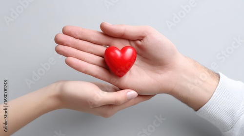 A vibrant red heart rests gently in the joined hands of a couple, symbolizing love and care against a clean backdrop.