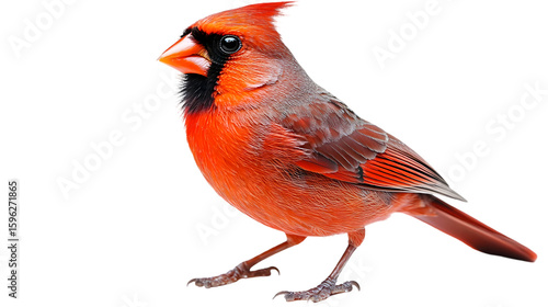 A vibrant red male Northern Cardinal stands in profile against a white background, showcasing its distinctive crest and black mask.