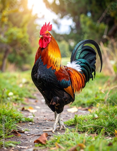 rooster, bird, animal, colourful, plumage, nature, path, outdoors, farm, agriculture, countryside, vibrant, red, comb, tail, feather, standing, ground, garden, green, natural, sunlight, bright, high-coloured, colours, detail, close, beautiful, creative, modern, elegant, stylish, professional, decorative, stunning, amazing, marvellously, fantastic, gorgeous, lovely, charming, attractive, impressive, spectacular, magnificent, excellent, honed