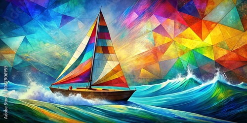 A vibrant sailboat with a colorful sail cuts through turquoise waves under a sky of geometrically arranged color blocks.