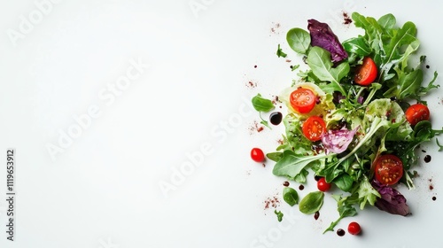 A vibrant salad featuring mixed greens, cherry tomatoes, and herbs on a clean background.