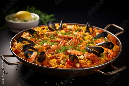paella, seafood, herb, rice, lemon, dish, cookery, food, meal, ingredient, receipe, table, eatery, invite, season, healthy, fresh, background, friendship, spanish, artful, savour, cater, family, oil, olive, colourful, garnish, stir, simmer, event, platter, dark, serve, mussel, delicious, garlic, choice, accessing, scallop, nourishment, favor, texture, eatery, epicure, luxury, clam, pepper