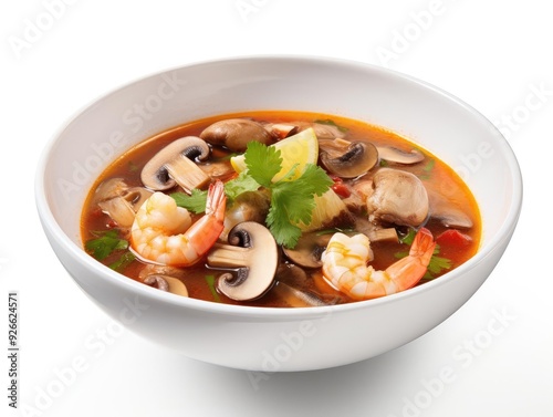 A vibrant seafood soup featuring shrimp, mushrooms, and fresh herbs in a savory broth, ideal for food lovers and culinary enthusiasts.