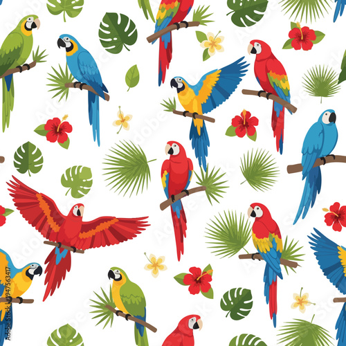 A vibrant seamless pattern of colorful parrots, hibiscus flowers, and tropical leaves