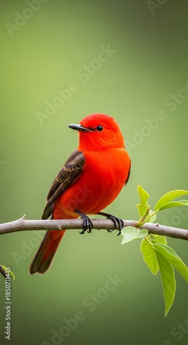 A vibrant, small bird with fiery red plumage and a dark back perches on a slender branch against a blurred green backdrop