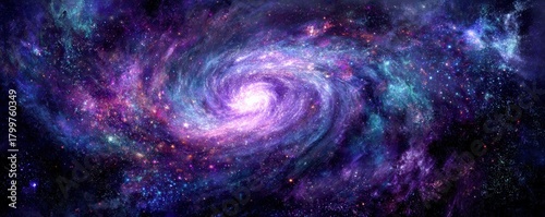 A vibrant spiral galaxy filled with hues of purple, blue, and white stars, showcasing the vastness of the universe against a dark backdrop.